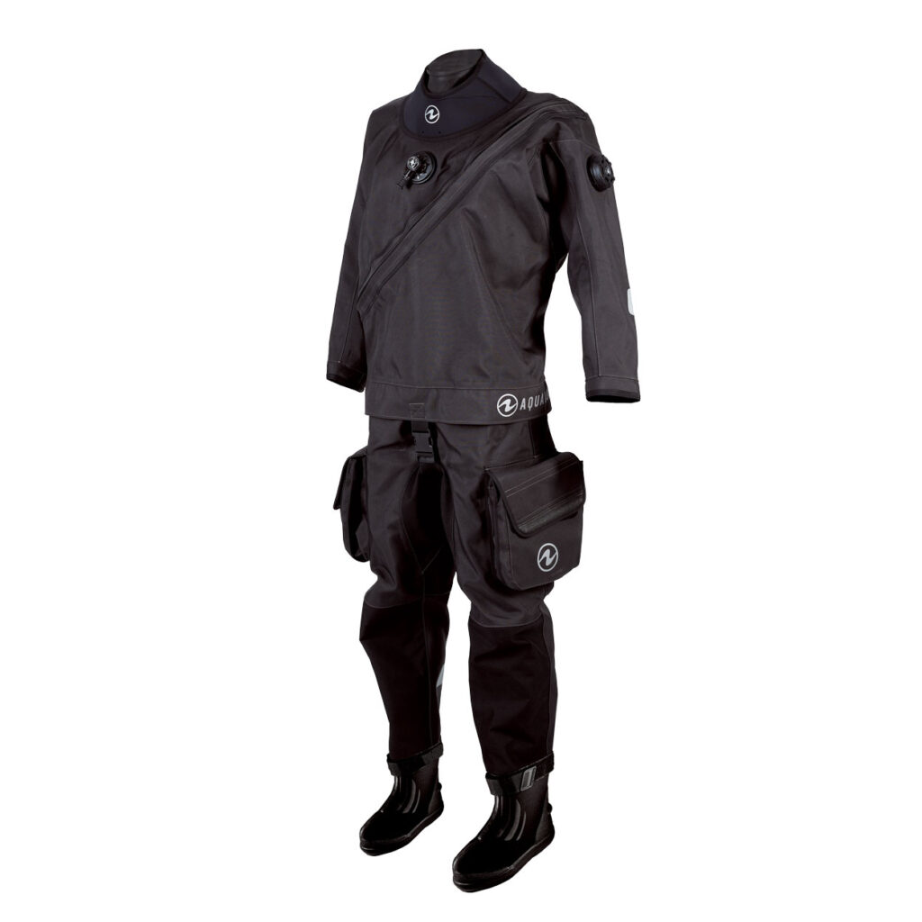 テレスコピックトルソーにフロントジッパーを備えた最新の3重ラミネート構造、ダイバーが自分で装着可能なシェルタイプドライスーツ。ネックシールとリストシールはラテックス製(ネオプレーンに変更可能・詳細はお問合せください)で、ブーツは推奨サイズを取付け済みですが指定サイズに交換(2 週間かかります)が可能です。